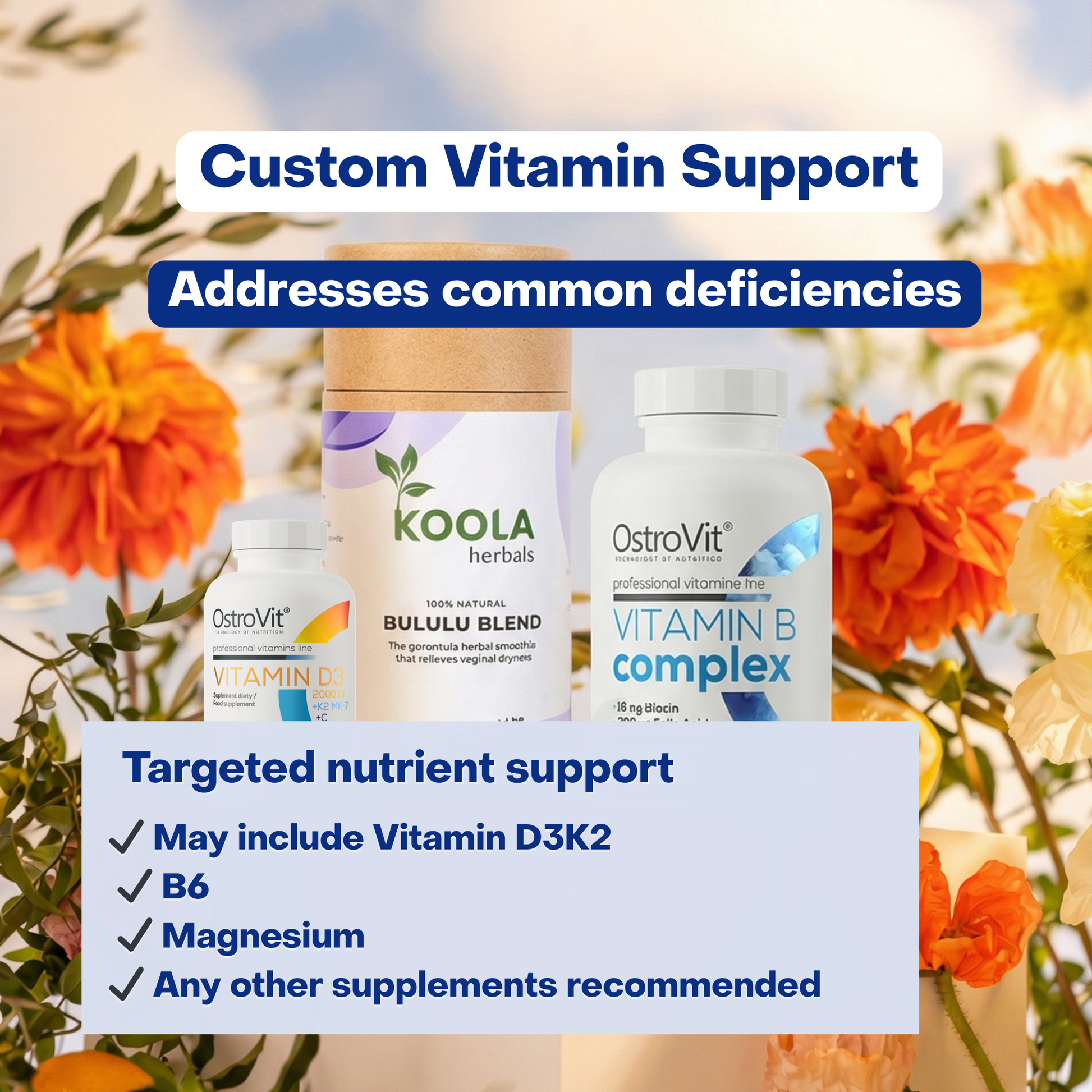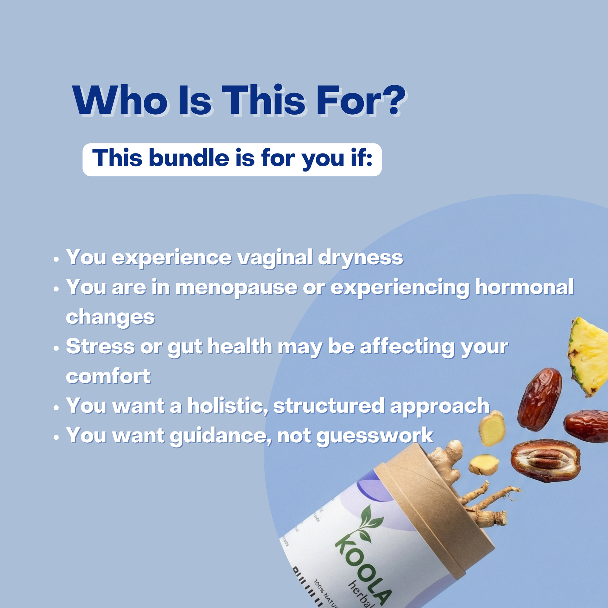 Dieses Bundle wurde entwickelt, um Ihnen einen klaren Fahrplan zur Unterstützung zu geben. Es kombiniert Kräuterpflege, Ernährungsberatung und personalisiertes Coaching, um vaginale Trockenheit an der Wurzel zu bekämpfen und gleichzeitig die allgemeine Körperfeuchtigkeit und das hormonelle Gleichgewicht zu fördern.